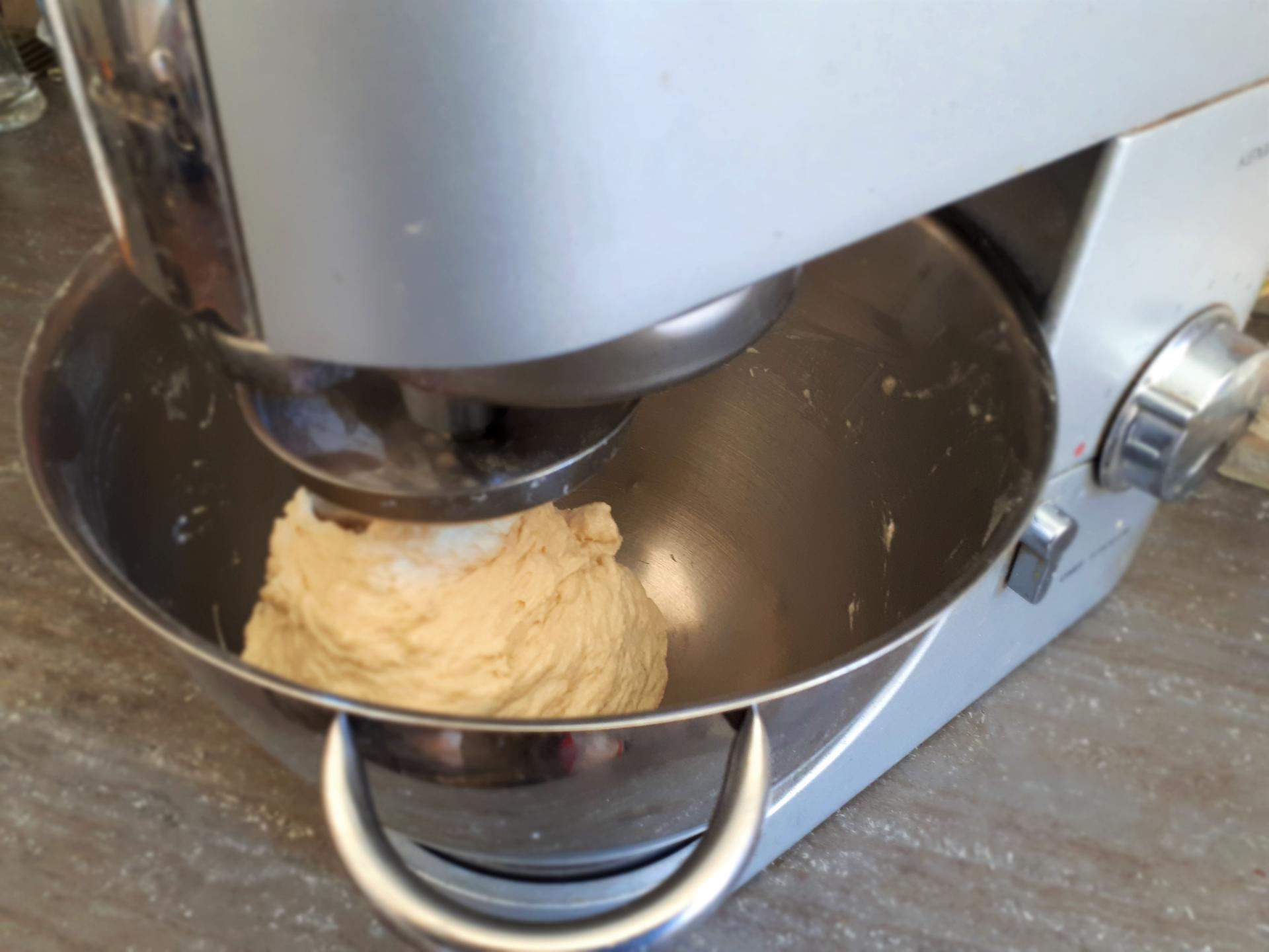 - Das restliche Wasser und das Öl zugeben und zu einem geschmeidigen Teig kneten.